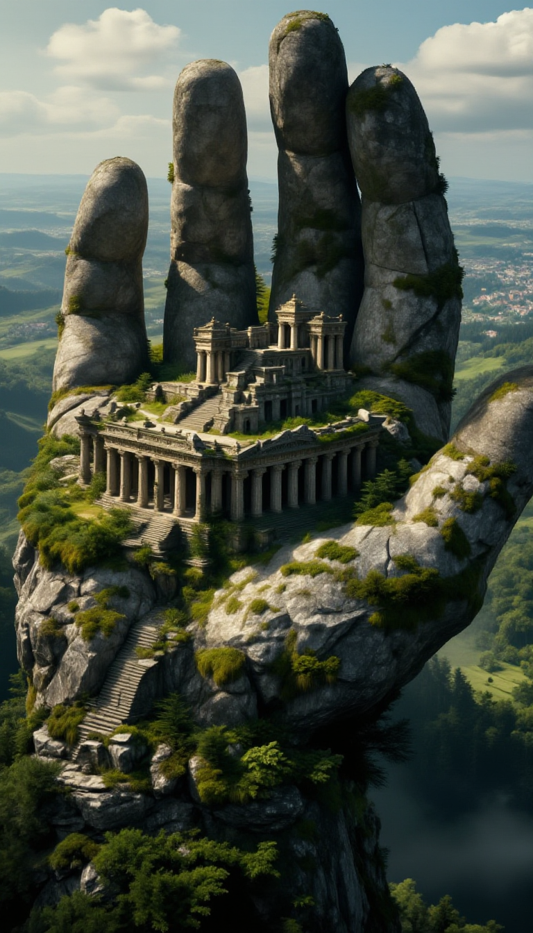 A colossal stone hand, weathered and ancient, emerges from a mountain range, overgrown with moss and vegetation. Perched atop the palm and fingers is a sprawling, classical-style temple complex with intricate columns, tiered architecture, and grand staircases, appearing to be part of the hand itself. The scene is set in a vibrant, verdant landscape with rolling hills, dense forests, and a distant, hazy cityscape or town. The atmosphere is epic, surreal, and awe-inspiring, evoking a sense of forgotten civilization or a deity's touch upon the earth. The lighting is soft, natural daylight, with gentle clouds in a bright sky casting subtle shadows, suggesting an early morning or late afternoon. The color palette is dominated by earthy greens, greys of stone, and muted blues of the sky, creating a serene yet powerful mood. The composition is a wide shot, emphasizing the immense scale of the stone hand and its integrated structures against the vastness of the natural world. A slight aerial perspective is used, looking down upon the hand and temple. The style is photorealistic fantasy art, reminiscent of artists like Zdzisław Beksiński or digital matte paintings. High detail, 8k resolution, cinematic lighting, volumetric fog, sharp focus.
