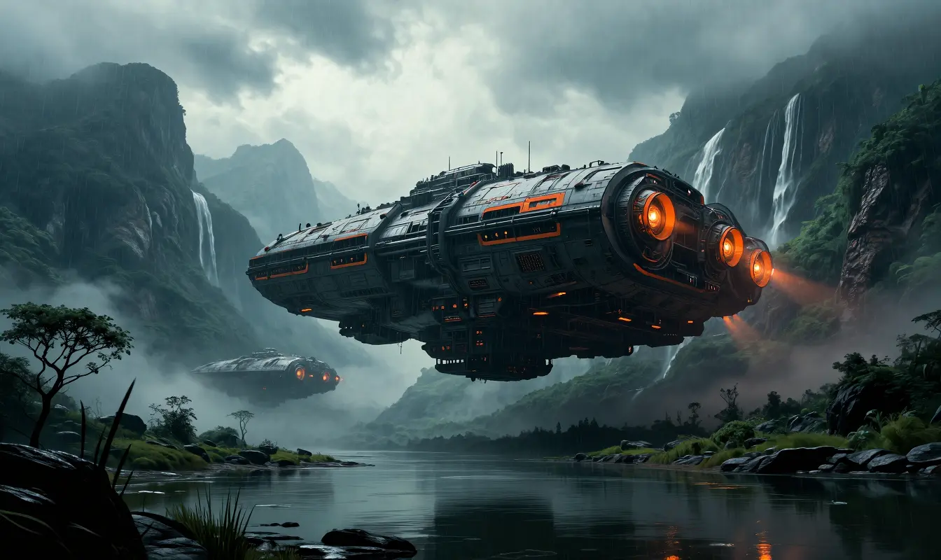 Colors and Mood: Dominant colors are dark greens, grays, and blues of the landscape and sky, contrasted with the utilitarian dark metal and striking orange of the spaceship. The mood is epic, awe-inspiring, and a touch melancholic, conveying a sense of exploration in a wild and untamed environment.