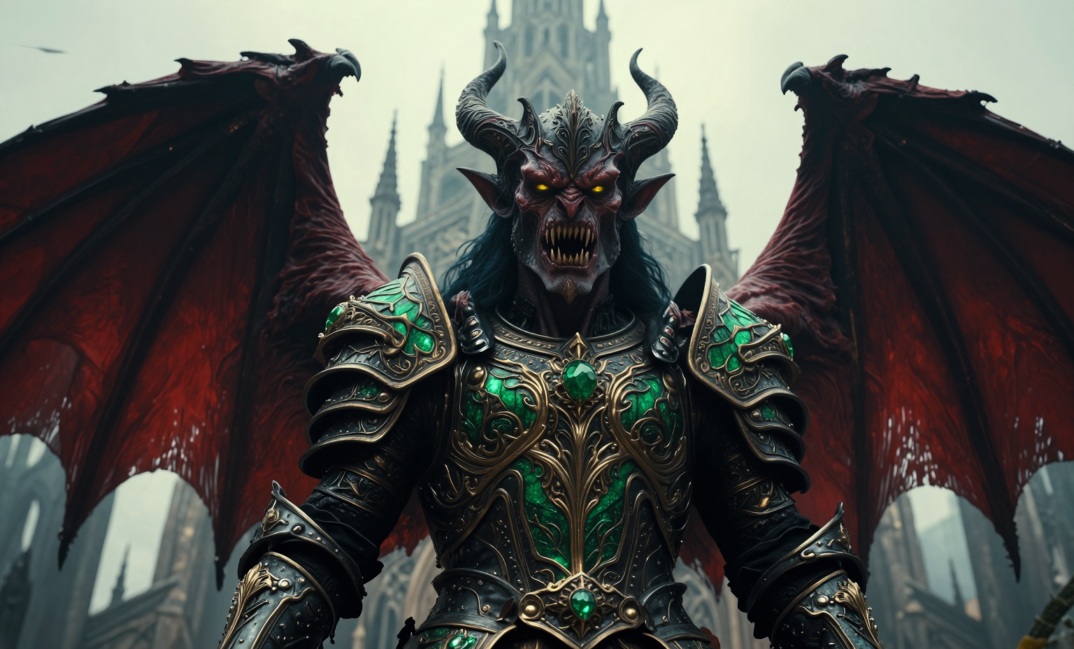 A fearsome demon lord, clad in ornate, dark obsidian armor with intricate gold filigree and emerald green accents, featuring large, leathery red wings unfurled. The creature has glowing yellow eyes and sharp, menacing teeth. The background depicts gothic-inspired architectural spires under a hazy, pale sky. The overall mood is dark fantasy, epic, and intimidating. The lighting is diffused and atmospheric, with a hint of a divine or otherworldly glow. The composition is a close-up, chest-up portrait, emphasizing the detailed armor and the creature's imposing presence. The style is highly detailed, resembling digital painting with a cinematic, hyperrealistic aesthetic. Photographed with a wide-angle lens, low-angle shot, shallow depth of field, cinematic lighting, ultra-detailed, 8k, trending on ArtStation.