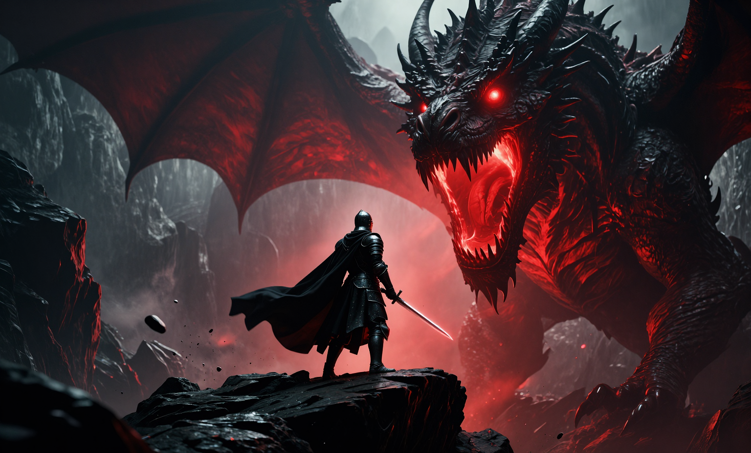 A lone knight in dark armor, wearing a flowing cape and a helmet with a cross insignia, stands on a rocky precipice, holding a glowing sword. Facing the knight is a colossal, menacing dragon with glowing red eyes and a gaping maw emitting intense red light. The scene is set in a dramatic, rocky environment with debris falling from above, suggesting a fierce battle or cataclysmic event. The overall mood is dark, epic, and foreboding. Lighting is dramatic and high-contrast, with strong rim lighting and the dragon's internal glow illuminating the scene. The color palette is dominated by dark grays, blacks, and deep reds, with stark highlights. The composition emphasizes the immense scale difference between the knight and the dragon, with a low-angle shot looking up at the dragon. The artistic style is reminiscent of dark fantasy concept art or digital painting. --ar 16:9 --style raw --chaos 70 --q 2
