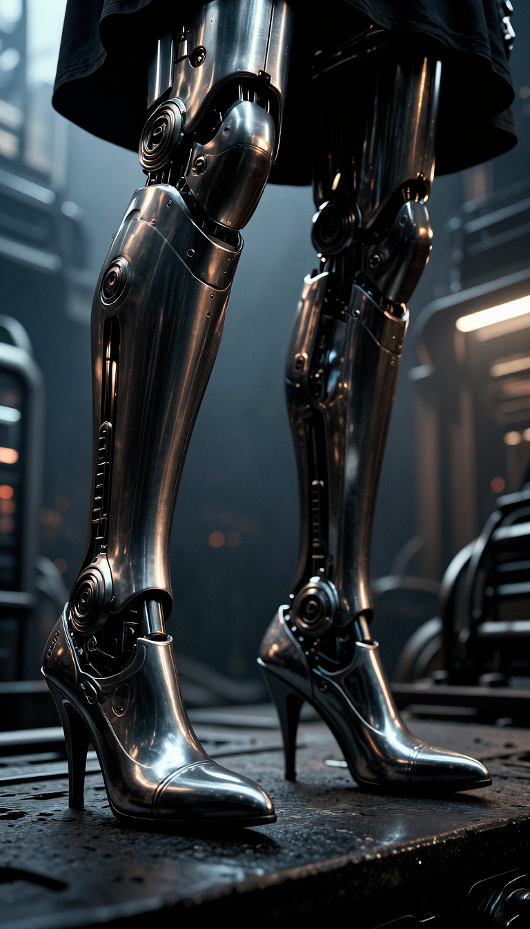Close-up view of sleek, metallic robotic legs and high-heeled shoes in a futuristic, industrial setting. The style is hyperrealistic with a gritty, cyberpunk aesthetic. The lighting is dramatic, with strong highlights reflecting off the polished metal surfaces, casting deep shadows and creating a sense of depth and mystery. The color palette is dominated by dark grays, blacks, and metallic tones, with hints of cool blue and subtle warm light sources in the background suggesting an urban, industrial environment. The composition is a low-angle shot, emphasizing the powerful and imposing nature of the subject, with a shallow depth of field blurring the background and drawing attention to the intricate details of the cybernetic legs and footwear. The mood is dark, sophisticated, and slightly menacing. Inspired by the visual style of sci-fi concept art and the intricate designs of biomechanical art. High detail, 8k resolution, photorealistic.