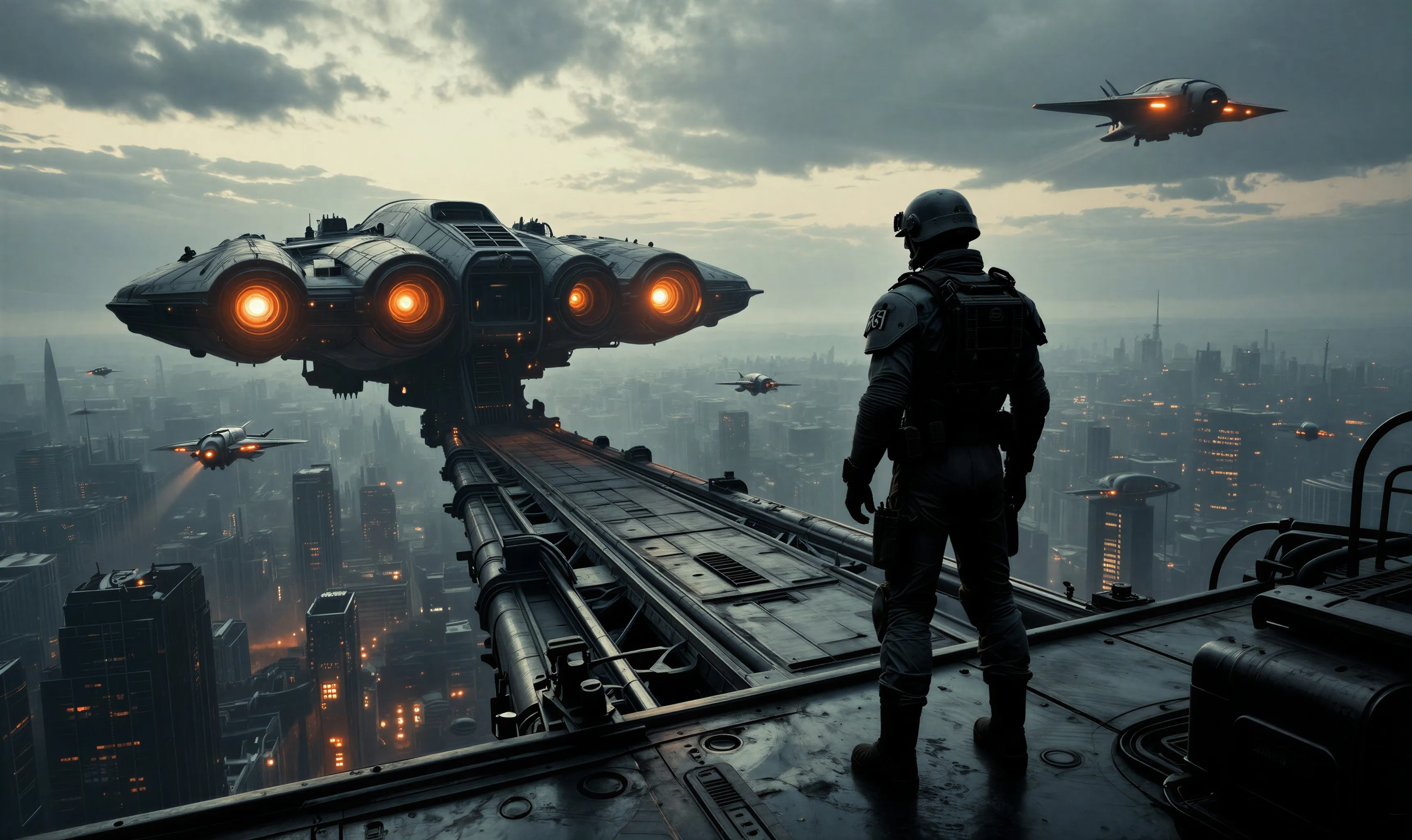 A lone soldier in advanced, dark grey tactical armor, helmet with a "546" marking, stands silhouetted against a sprawling, futuristic cityscape under a cloudy, twilight sky. In the foreground, a massive, utilitarian spacecraft with glowing orange engines is being prepared for departure, viewed from a high-angle perspective looking down onto a metallic, industrial platform. Smaller, agile fighter crafts with glowing orange lights are scattered across the misty, dystopian urban landscape, some engaged in distant aerial combat. The overall mood is gritty, epic, and melancholic, with a strong emphasis on industrial design and a muted, desaturated color palette dominated by greys, blues, and the stark contrast of the engine glow. The lighting is atmospheric, with a diffused, overcast sky providing soft ambient light, punctuated by the harsh artificial lights of the city and the intense glow from the spacecraft's engines, creating dramatic chiaroscuro effects. The composition is dynamic, with strong leading lines from the platform and the spacecraft's structure guiding the eye towards the distant city and the soldier. The artistic style is reminiscent of concept art for a science fiction film, with a painterly, detailed finish and a sense of immense scale.