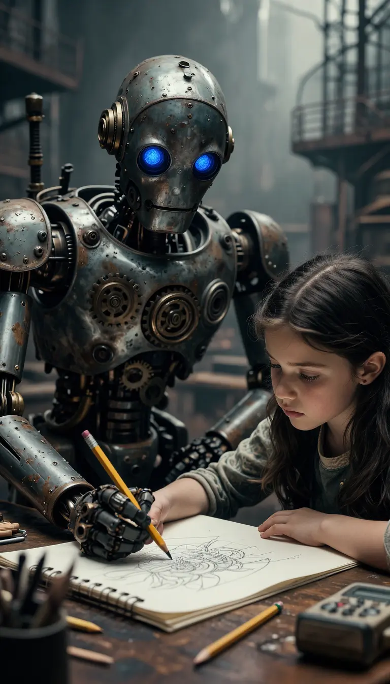 A weathered, intricate steampunk robot with glowing blue eyes and visible internal gears, holding a yellow pencil poised over a sketchpad. Beside it, a young girl with dark hair gazes intently at her own drawing. The scene is set at a wooden desk, with art supplies scattered. The background is a muted, industrial cityscape, softly out of focus. The overall mood is one of quiet contemplation and artistic collaboration. The lighting is atmospheric, with soft, diffused light creating a painterly quality and emphasizing textures. The color palette is dominated by muted browns, grays, and subtle ochres, with the blue of the robot's eyes and the yellow of the pencils providing focal points. The composition is a medium shot, with a slightly low camera angle that emphasizes the robot's imposing presence. The depth of field is shallow, blurring the background to keep the focus on the subjects. The style is highly detailed, reminiscent of concept art or a matte painting, with a strong sense of realism in the metallic textures and worn surfaces. The image evokes a feeling of the uncanny, blending the mechanical with the artistic and human. Highly detailed, photorealistic rendering, cinematic lighting, 8k resolution.