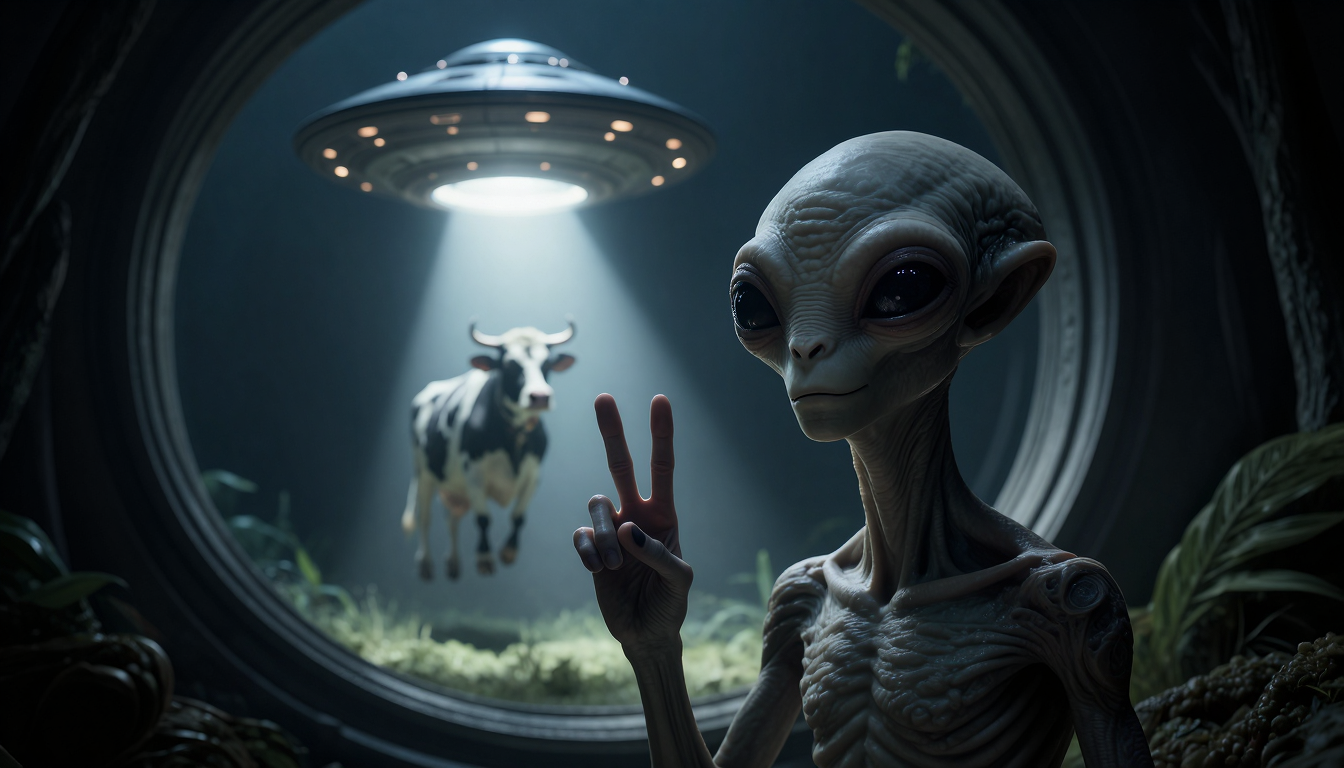 A grey alien, with large dark eyes and a slender physique, is in the foreground, holding up two fingers in a peace sign. Behind it, through what appears to be a circular window or portal, a classic flying saucer hovers, beaming a bright light down onto a levitating cow. The scene has a dark, mysterious, and slightly humorous tone, rendered in a realistic, cinematic style with a focus on dramatic lighting. The color palette is dominated by deep blues, greys, and muted greens, with the bright beam of light providing a strong contrast. The composition is a close-up of the alien, with the background elements framed within the circular opening, creating a sense of depth. The lighting is chiaroscuro, with strong highlights and deep shadows, enhancing the otherworldly and eerie atmosphere. The image evokes a feeling of science fiction wonder and a touch of absurdity. Shot with a wide-angle lens, shallow depth of field, evoking the style of H.R. Giger meets an absurdist parody. --ar 16:9 --style raw --v 5.2 --q 2 --s 750