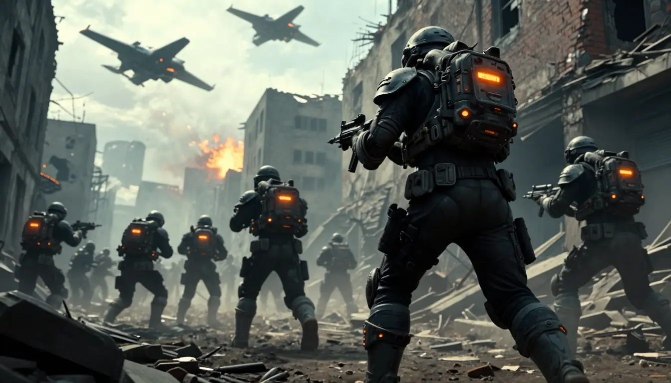 A gritty, action-packed scene of futuristic soldiers advancing through a war-torn urban environment. The soldiers are heavily armored, clad in dark tactical gear with glowing orange accents on their backpacks and helmets. They are armed with advanced weaponry, some crouching low as if taking cover, while others are in mid-stride, moving with purpose. In the background, damaged buildings with exposed brickwork loom, suggesting destruction. Above, aerial combat is underway, with sleek, dark futuristic aircraft engaged in battle, one of which appears to be exploding. The overall mood is intense and chaotic, yet determined. The lighting suggests a daytime battle with a slightly overcast sky, casting diffused light and creating atmospheric haze and dust. The color palette is dominated by muted grays, blacks, and browns of the debris and armor, punctuated by the vibrant orange glow from the soldiers' equipment and the fiery explosion in the sky. The composition is dynamic, with a low-angle perspective that emphasizes the soldiers' imposing presence and the scale of the destruction. The art style is painterly and realistic, with a strong sense of depth and texture, reminiscent of concept art for a sci-fi video game or film. --ar 16:9 --style raw --v 6