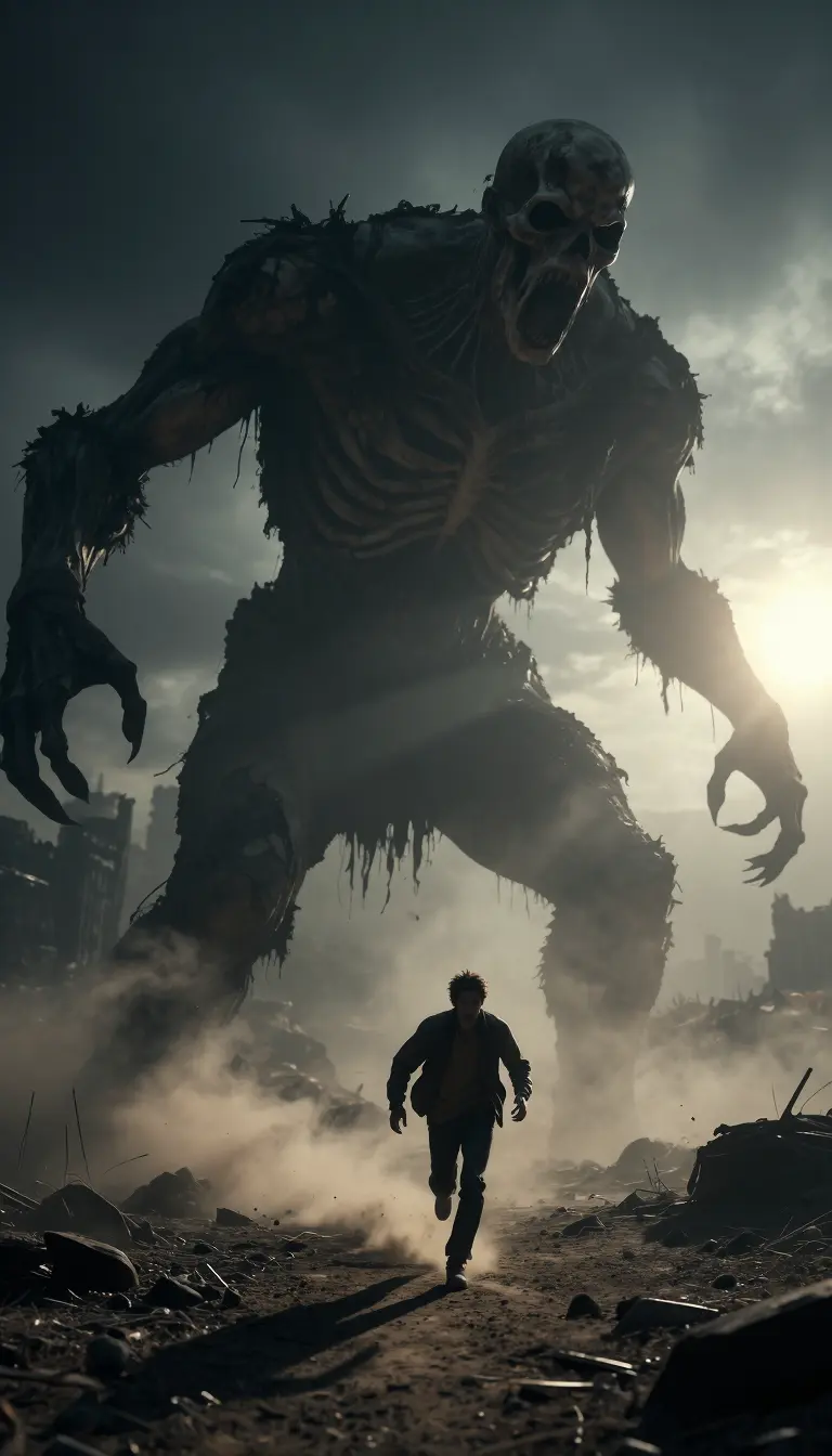 A colossal, skeletal, monstrous figure with tattered clothing and a decaying form, its jaw wide open in a terrifying roar, looms over a lone, desperate human figure running for survival across a desolate, post-apocalyptic landscape. The scene is rendered in a dark, gritty, and atmospheric style, evoking a sense of dread and impending doom. Dramatic, low-key lighting with strong backlighting from a hazy, setting sun casts long shadows and highlights the dust and debris swirling in the air. The color palette is muted and desaturated, dominated by grays, browns, and ochre tones, with subtle hints of orange from the sun. The composition uses a low-angle perspective to emphasize the immense scale of the monster, with the human figure positioned in the foreground, creating a strong sense of scale and vulnerability. The background features blurred silhouettes of ruined structures and an oppressive, smog-filled sky. The overall mood is intense, terrifying, and bleak. Cinematic, hyperrealistic rendering, intricate detail, wide-angle lens, shallow depth of field, volumetric lighting, sharp focus on the characters, 8k, Unreal Engine, octane render, cinematic lighting, high detail, dramatic composition, post-apocalyptic aesthetic, horror, survival.