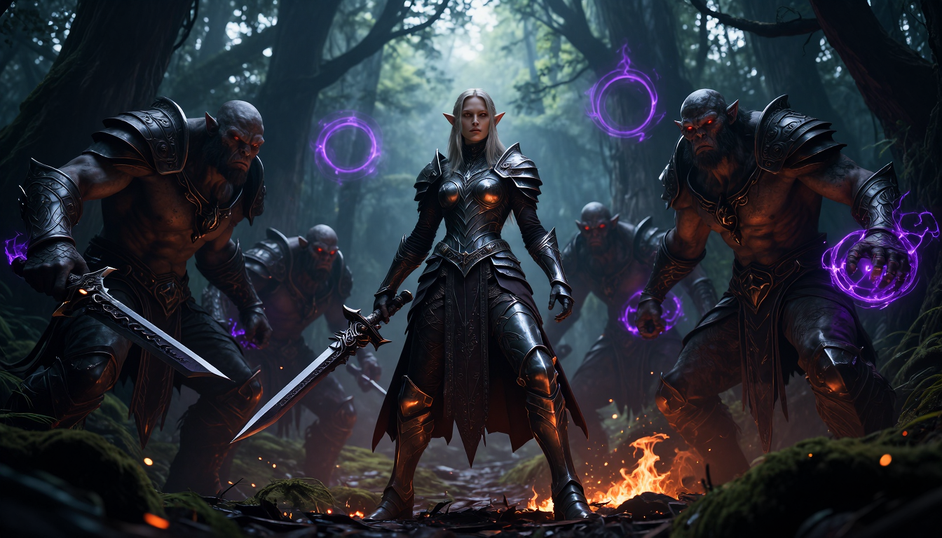 A dominant, powerful female elf warrior, clad in intricate, dark, metallic armor with sharp, angular pauldrons and a spiked hip guard, stands centered in a dark, mystical forest. She is flanked by several menacing, muscular orc-like creatures with glowing red eyes and ornate, segmented armor, some wielding jagged weapons crackling with purple energy, and others conjuring glowing purple magic circles. The composition is dynamic and slightly low-angle, emphasizing the imposing nature of the figures.