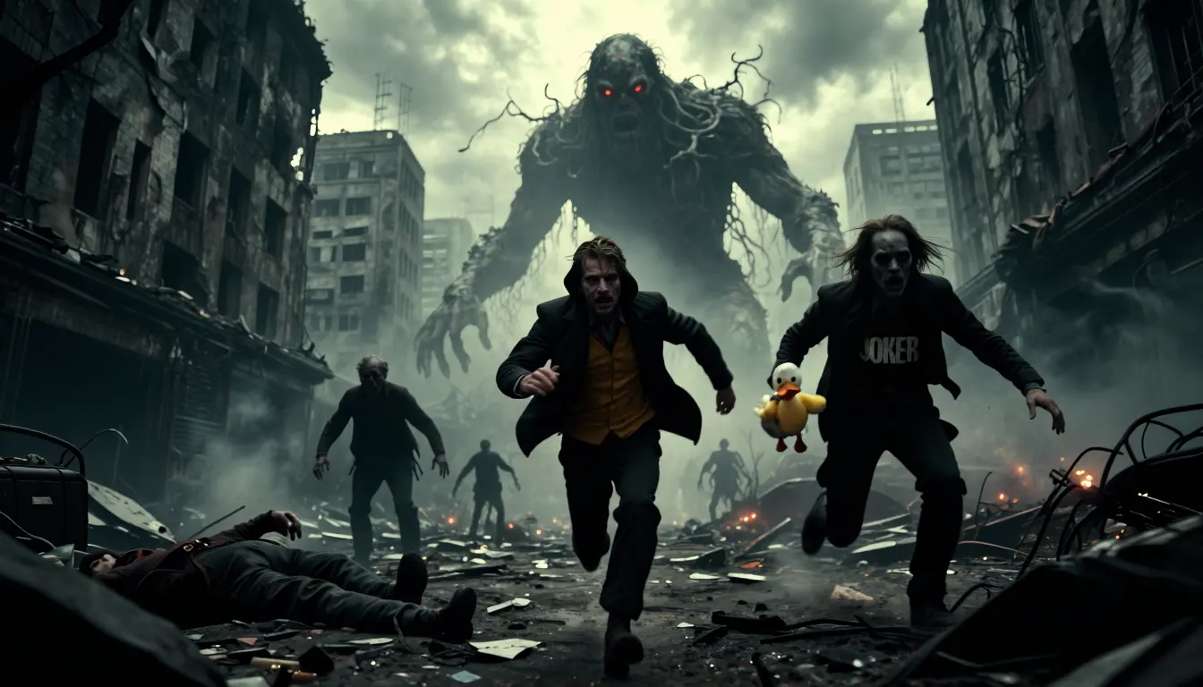 A man in a black hoodie with "JOKER" emblazoned on it runs frantically through a post-apocalyptic cityscape. He's being chased by a gaunt, pale creature with long hair and a duck toy clutched in its hand. In the background, a colossal, monstrous entity with glowing red eyes and vines growing from its head looms over the ruined buildings, emitting smoke. The scene is chaotic and filled with destruction, with rubble and debris scattered everywhere, and a zombie-like figure can be seen in the mid-ground, while another person lies motionless in the foreground. The overall mood is dark, terrifying, and dramatic, with a heavy, overcast sky. The color palette is desaturated with pops of muted greens, grays, and the man's hoodie. The lighting is moody and dramatic, with harsh shadows and a diffused, eerie glow. The composition places the man and his pursuer in the foreground, drawing immediate attention to the chase, while the giant monster dominates the background. The image has a cinematic, horror-fantasy aesthetic. --ar 16:9 --v 5.2 --style raw --q 2