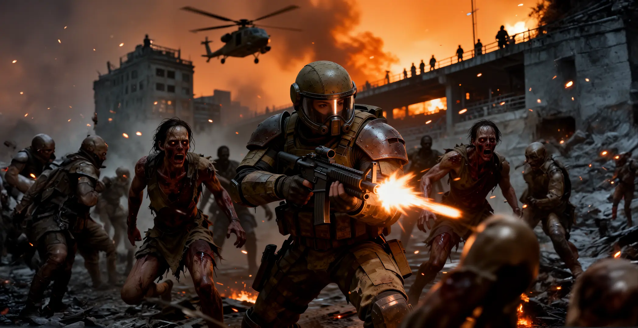 A heavily armored soldier wearing a helmet and visor fires a machine gun, the muzzle flash illuminating the scene in a chaotic post-apocalyptic urban environment. Zombies, their flesh rotting and their clothes tattered, rush forward. A helicopter hovers in the background, and silhouettes of people are visible on a raised platform, perhaps a stadium or a bridge, beneath a smoky, orange sky filled with smoldering embers. The overall style is dark, gritty, and cinematic, reminiscent of a video game or survival horror film. The lighting is dramatic, with strong contrasts between the fire, the muzzle flash, and deep shadows. The color palette is dominated by muted browns, grays, and oranges, creating a mood of desperation and tense conflict. The composition is dynamic, with the soldier and the zombies forming the central conflict, while background elements add depth and context. The camera angle is low, emphasizing the soldier's power and the overwhelming threat of the zombies. A shallow depth of field focuses attention on the immediate action. Highly detailed, photorealistic digital painting, concept art, epic scale, tense action, survival horror, volumetric lighting, dramatic atmosphere.