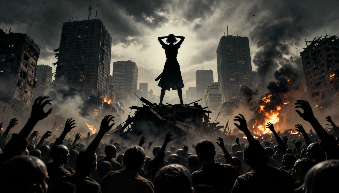 A defiant woman stands tall with her hands behind her head atop a broken structure, silhouetted against a chaotic, post-apocalyptic city skyline. The scene is rendered in a dark, gritty, and realistic digital painting style, evoking a sense of desperation and resilience. Explosions and smoke billow from the ruined skyscrapers in the background, casting an ominous glow. The foreground is a mass of outstretched, grasping hands belonging to a horde of zombies, their forms blurred and menacing. The color palette is dominated by muted grays, browns, and blacks, with fiery oranges and yellows from the explosions providing stark contrast. The composition uses a low-angle shot, emphasizing the woman's dominance over the undead horde. The atmosphere is heavy with dust and despair, illuminated by the harsh light of the explosions and a dim, overcast sky. The overall mood is one of survival against overwhelming odds, with a touch of dark glamour. --ar 16:9 --style raw --q 2 --v 5.2