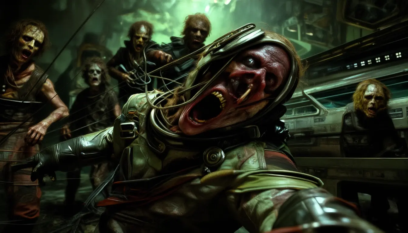 A close-up, dramatic portrait of a grotesque zombie in a damaged, filthy astronaut spacesuit, with a cracked visor and an open mouth emitting a terrifying scream. The suit is a dull olive green, showing signs of wear, with exposed wires and metal parts. Behind the lead zombie, a horde of other decaying figures in similarly grim clothing advances, some holding crude weapons, their faces distorted and menacing. The overall style is dark, gritty, and post-apocalyptic, with a sense of impending doom. The action takes place inside a gigantic, severely damaged spaceship. The lighting is harsh and dramatic, with strong contrasts and a sickly green atmospheric glow emanating from the background, suggesting a toxic environment or alien lighting. The color palette is dominated by muted greens, browns, and grays, with accents of sickly yellow and pale white on the zombies' skin and teeth. The composition is a close-up, tense shot, with the main zombie filling the foreground, his outstretched arm almost extending beyond the frame, creating a sense of imminent menace. The art style is a blend of dark sci-fi horror and painterly, gritty textures. Shot from a low angle, the zombies' terrifying scale is emphasized. The detail is high, cinematic, and tense.
