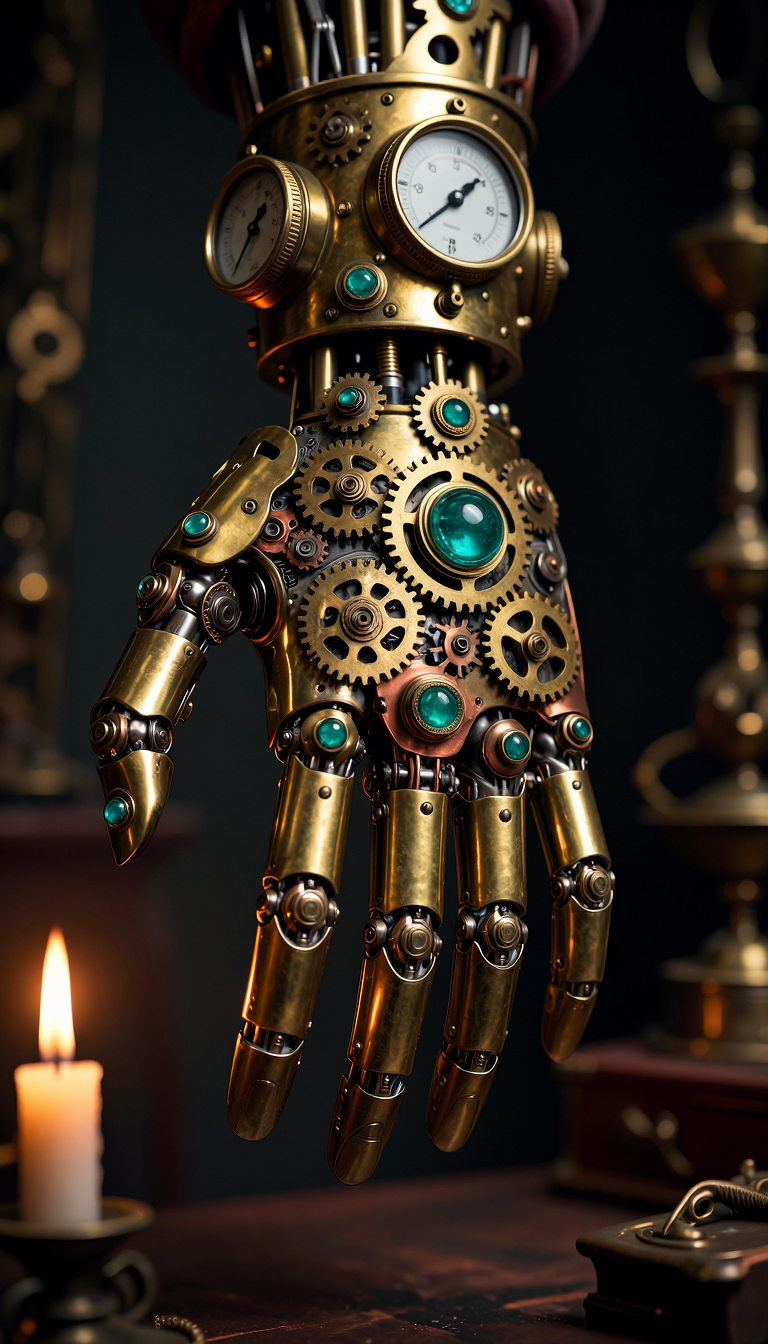 A highly detailed, ornate steampunk prosthetic hand, rendered in polished brass and bronze with intricate gears, rivets, and turquoise inlays. The hand is posed in a close-up, low-angle shot, with its fingers slightly curled. The background is dark and moody, with a soft glow from a single, out-of-focus candle. The overall mood is one of vintage elegance and mechanical marvel. The lighting is warm and dramatic, with strong chiaroscuro effects highlighting the metallic textures and intricate details. The color palette is dominated by rich golds, browns, and teals, with subtle red accents. The composition is dynamic, drawing the viewer's eye across the complex surface of the prosthetic. Shot with a macro lens, shallow depth of field, and a cinematic aspect ratio. --style raw --ar 16:9 --v 5.2 --q 2