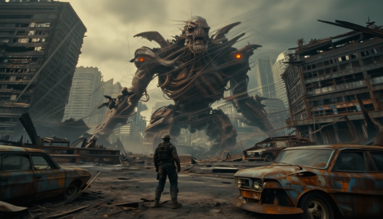 A colossal, horrifying biomechanical kaiju with a skeletal, decayed appearance and glowing orange eyes stands ominously in the center of a ruined, post-apocalyptic city. The creature is a nightmarish fusion of organic decay, rusted metal, wires, and mechanical components, with its mouth agape in a silent scream. In the foreground, a lone soldier in weathered tactical gear stands with their back to the viewer, facing the monstrous entity. The cityscape surrounding them is a desolate panorama of crumbling skyscrapers, abandoned, rusted-out vehicles, and debris. The atmosphere is heavy and somber, with a hazy, overcast sky and a sense of immense scale and dread. The color palette is dominated by muted earthy tones, rusts, grays, and dull greens, contrasted by the creature's piercing orange eyes. The composition is a wide shot, emphasizing the vastness of the destroyed environment and the overwhelming presence of the kaiju. The artistic style is dark fantasy and grim sci-fi, reminiscent of H.R. Giger and Zdzisław Beksiński. Lighting is diffused and atmospheric, casting long shadows and highlighting the textures of decay and destruction. The image has a cinematic quality, with a low camera angle looking up at the kaiju to enhance its terrifying grandeur. --ar 16:9 --style raw --v 5.2 --q 2