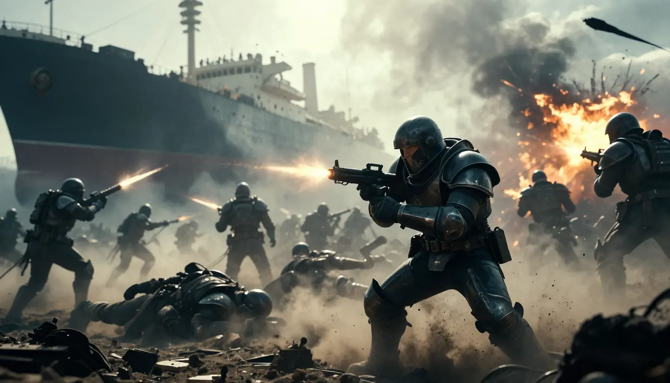 A dynamic, chaotic battlefield scene depicting heavily armored ODST troopers in futuristic suits engaged in a fierce battle. The focus is on a soldier in the foreground, crouched and holding out his weapon, surrounded by dust and debris. The hulk of a gigantic freighter dominates the background, while other soldiers are in various states of collapse: some falling, others firing, and one suspended in midair, dispersed by an explosion. The atmosphere is thick with smoke, explosions, and muzzle flashes, suggesting an intense battle. The lighting is dramatic, with strong contrasts of light and shadow, primarily illuminated by a bright, foggy sky and fiery explosions. The color palette is muted, dominated by grays, browns, and metallic tones, with splashes of orange and yellow from the explosions. The composition is dynamic and action-packed, with diagonal lines and a sense of movement and urgency. The art style is gritty and realistic, reminiscent of modern military sci-fi. The overall mood is tense, urgent, and desperate. The camera angle is low, emphasizing the power and scale of the conflict. The depth of field is shallow, with the foreground and midground in sharp focus and the background subtly blurred, drawing the viewer's attention to the action. Cinematic, epic, tense, hyperrealistic, high detail, 8K, rendered on Unreal Engine, volumetric lighting, motion blur, atmospheric perspective.