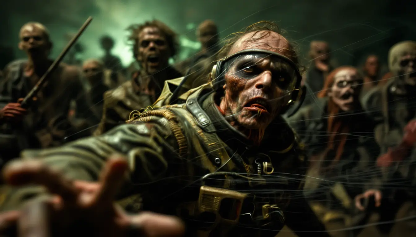 A close-up, dramatic portrait of a grotesque zombie in a damaged, dirty astronaut suit, with its visor cracked and mouth agape in a horrifying scream. The suit is a dull, olive green, showing wear and tear, with exposed wires and metal components. Behind the main zombie, a horde of other decaying figures in similar, grim attire advance, some holding crude weapons, their faces distorted and menacing. The overall style is dark, gritty, and post-apocalyptic, with a sense of impending doom. Lighting is harsh and dramatic, with strong contrasts and a sickly green, atmospheric glow emanating from the background, suggesting a toxic environment or alien illumination. The color palette is dominated by muted greens, browns, and grays, with accents of sickly yellow and pale white on the zombies' skin and teeth. The composition is a tight, urgent shot, with the primary zombie filling the foreground, its outstretched hand almost reaching out of the frame, creating a sense of immediate threat. The artistic style evokes a blend of grim sci-fi horror and a painterly, rough texture. Shot with a low-angle perspective, emphasizing the terrifying scale of the zombies. Highly detailed, cinematic, and intense.