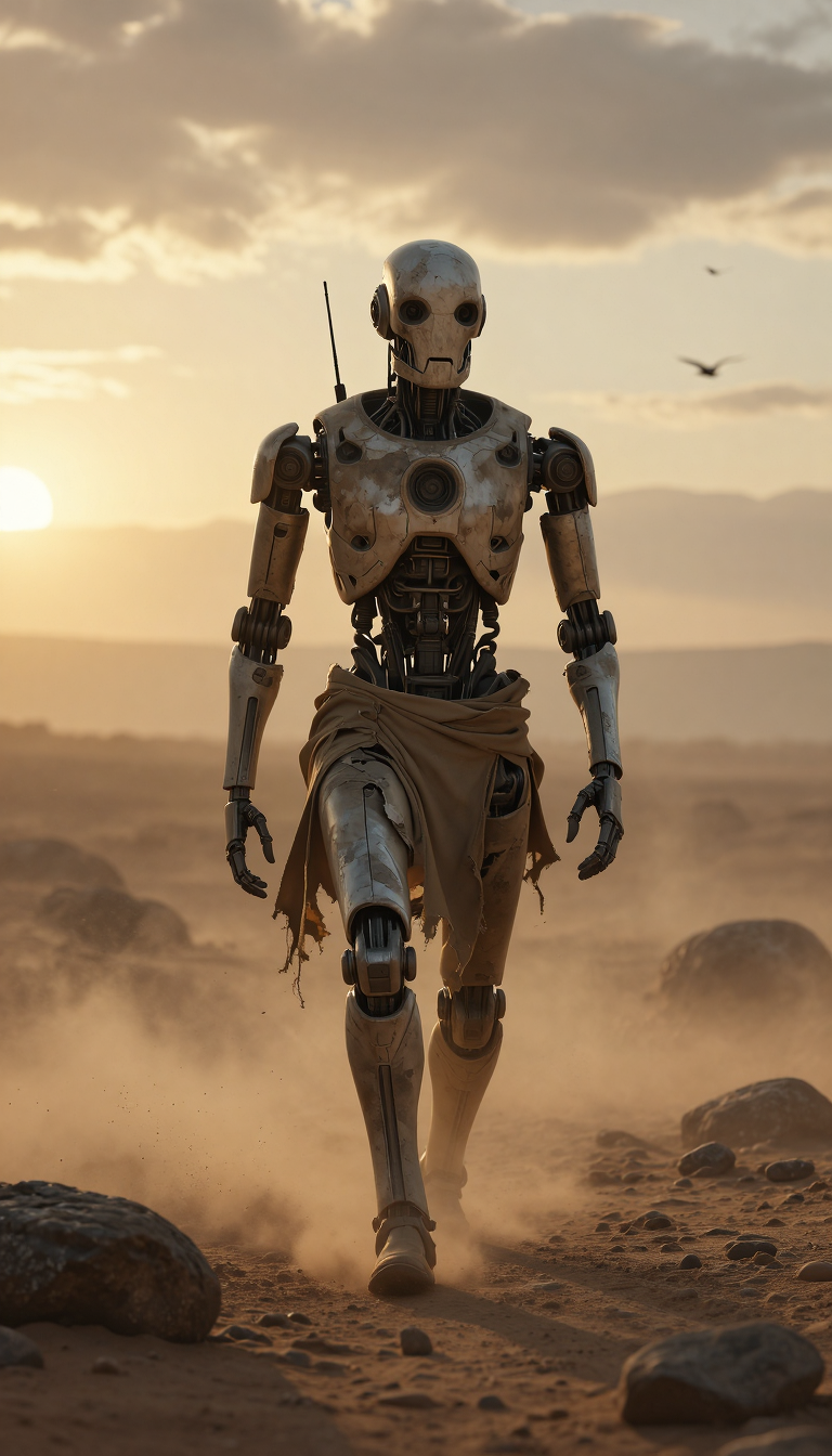 A lone, weathered android walks through a desolate, dusty landscape. The android is humanoid, with intricate mechanical joints and a complex chest plate, wearing a torn, fabric loincloth. Its head is a white, helmet-like casing with visible internal circuitry and a thin antenna extending upwards. The scene is bathed in the warm, hazy light of a setting sun, creating a strong sense of atmosphere and loneliness. Dust particles are kicked up by the android's feet, adding to the gritty, arid environment. The color palette is dominated by warm earth tones - ochres, browns, and muted yellows - with subtle hints of grey and white on the android. The composition places the android slightly off-center, walking towards the viewer, with sparse rocks and sand in the foreground and a hazy, cloud-filled sky with two distant birds in the background. The artistic style is reminiscent of concept art for science fiction films, with a painterly, textured quality. The lighting is dramatic and atmospheric, suggesting a harsh, post-apocalyptic setting. The mood is somber and introspective. Camera angle is a medium shot, slightly low, emphasizing the android's solitary journey. Depth of field is shallow, with the background softly blurred, drawing focus to the main subject. The overall rendering should be highly detailed and photorealistic, with a cinematic quality. --ar 3:4 --style raw