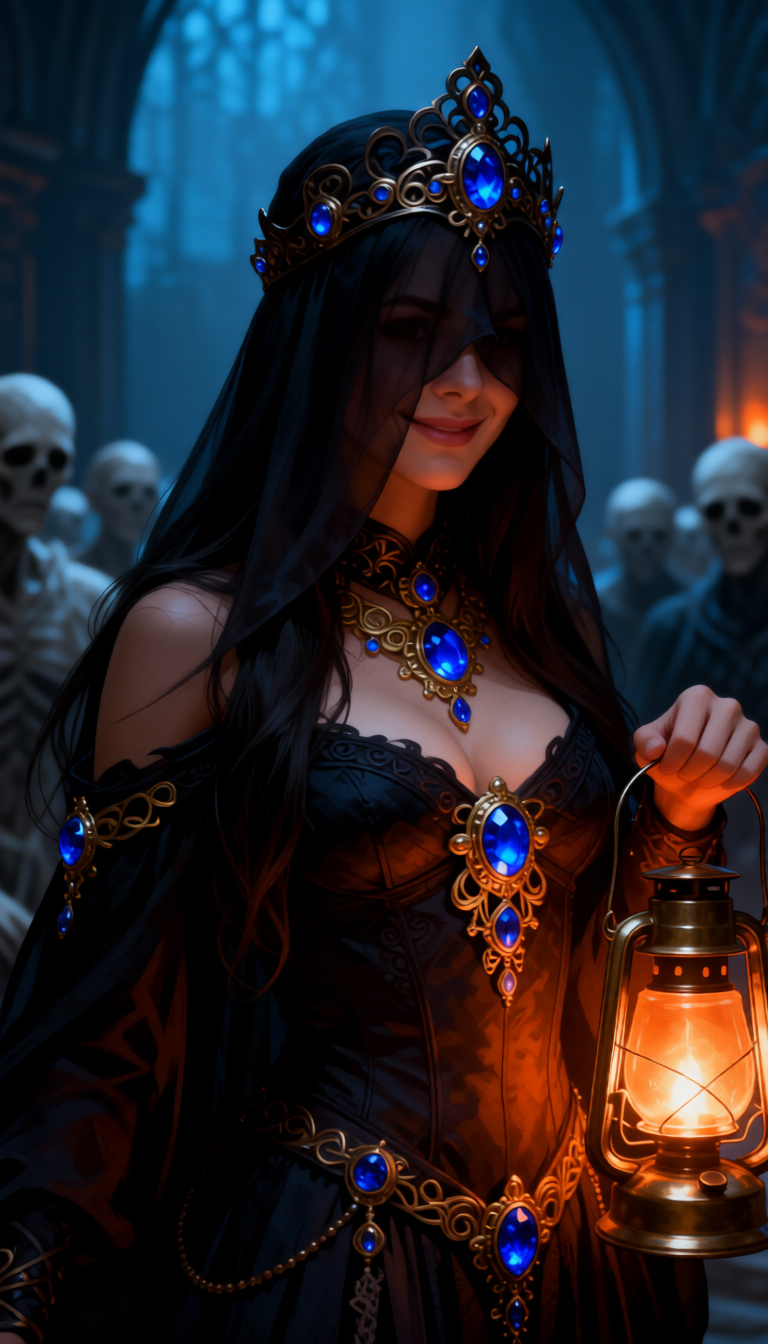 A mysterious woman with dark, flowing veils and an ornate headdress, partially obscuring her face, smiles eerily. She wears a revealing dark garment adorned with intricate gold jewelry featuring large, luminous blue gemstones. She holds a vintage brass lantern casting a warm, inviting glow. In the background, a shadowy assembly of pale, gaunt figures with vacant stares watch her. The scene is set in a dimly lit, gothic-inspired hall with a muted blue and gray color palette, punctuated by the warm orange light of the lantern. The atmosphere is one of dark enchantment and unsettling anticipation. Shot with a shallow depth of field, a medium shot framing the woman's torso and face, emphasizing her enigmatic expression and the opulent details of her attire. Cinematic lighting, high detail, fantasy art, digital painting. --ar 16:9 --v 5.2