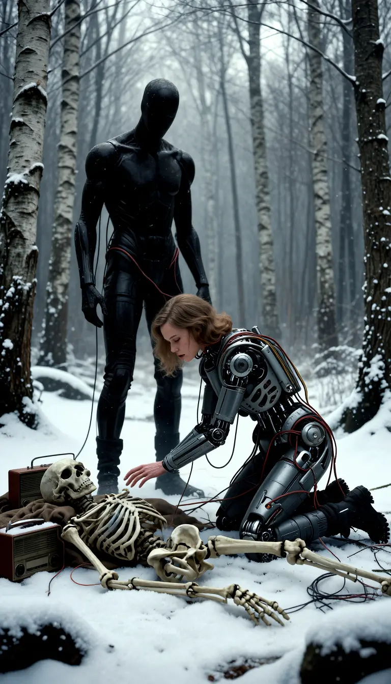 A bionic woman with cybernetic implants and cables attached to her back is kneeling in a snowy birch forest, reaching out to a deceased human skeleton lying in the snow. Beside the skeleton is a vintage radio and a rolled-up blanket. A tall, faceless, dark, glossy humanoid figure stands behind the woman, connected by cables to her. The scene is rendered in a gritty, detailed, painterly style with a somber, post-apocalyptic atmosphere. Soft, diffused daylight filters through the bare trees, casting subtle shadows and highlighting the falling snow. The color palette is desaturated with cool blues, grays, and whites, contrasted by the warm red and yellow of the connecting cables. The composition is slightly low-angle, emphasizing the characters and their surroundings. The overall mood is one of melancholy and exploration. --ar 16:9 --style raw --v 5.2 --q 2