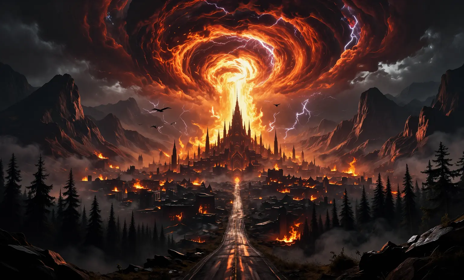 An epic, apocalyptic cityscape being consumed by a swirling vortex of fiery energy and lightning, a powerful cosmic event over a devastated urban landscape. The scene is rendered in a highly detailed, digital painting style with a dramatic, cinematic aesthetic, evoking a sense of awe and dread. Intense, high-contrast lighting emanates from the vortex and strikes, casting long, dramatic shadows across the burning city and surrounding rugged mountains. The color palette is dominated by fiery oranges, intense yellows, deep reds, and contrasting dark, stormy grays and browns, creating a mood of chaotic destruction and overwhelming power. Compositionally, the image uses a low-angle, wide-shot perspective, with a leading asphalt road drawing the viewer's eye directly towards the catastrophic event at the heart of the city, flanked by silhouetted, dark evergreen forests and imposing, rocky mountains. Silhouettes of flying creatures, possibly dragons or birds, are visible against the intense light. The atmosphere is thick with smoke, dust, and electrical discharges. Technical details include a deep depth of field with sharp focus on the city and vortex, while foreground elements and distant mountains are slightly softened to emphasize the scale. Inspired by the works of H.R. Giger for its dark fantasy and alien aesthetic, and by the dramatic compositions of classical disaster paintings. The overall image quality is hyperrealistic and rendered with extreme detail, 8k resolution, photorealistic textures, and volumetric lighting.