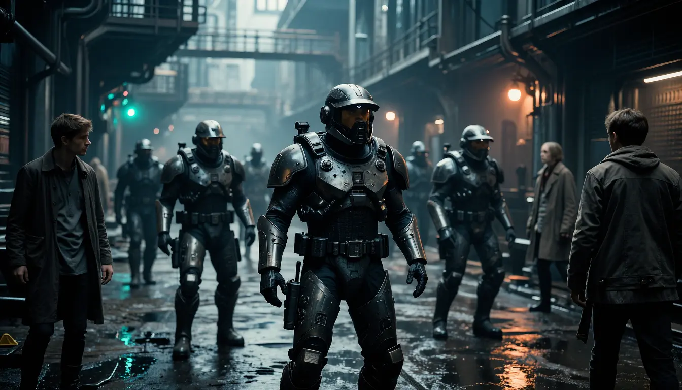 A gritty, dystopian industrial corridor filled with armored figures and civilian-clothed individuals. The scene is rendered in a hyperrealistic, cinematic style with a focus on detailed textures and atmospheric effects. Harsh, directional lighting emanates from overhead industrial lamps and is reflected off wet surfaces, creating dramatic highlights and deep shadows. The color palette is dominated by cool, desaturated blues, grays, and metallic tones, with occasional pops of orange and green from warning lights and glowing elements, conveying a sense of tension and unease. The composition is dynamic, with multiple figures creating a sense of depth and narrative action. A low-angle, wide shot emphasizes the scale of the environment and the imposing nature of the armored characters. Depth of field is shallow, drawing focus to the foreground figures and blurring the background. The overall mood is somber, tense, and highly cinematic, reminiscent of science fiction concept art or game environments. --ar 16:9 --style raw --v 5.2