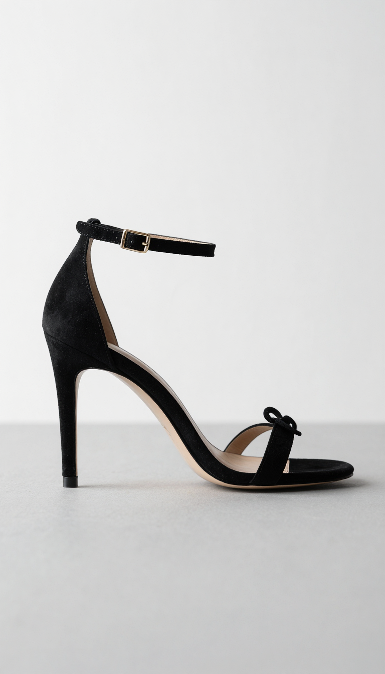 A single black suede stiletto sandal with delicate thin straps and a tiny bow at the toe, positioned on a neutral grey surface against a seamless white background. The sandal is presented in a minimalist, clean, and elegant studio shot. Soft, diffused lighting creates subtle highlights on the suede texture, emphasizing its velvety finish and the sharp silhouette of the shoe. The composition is side-profile, showcasing the graceful curve of the heel and the intricate strapping system. The mood is sophisticated and chic, with a focus on the product's design and material quality. The color palette is monochromatic, relying on the contrast between black and white with a hint of metallic gold on the buckle. The image has a shallow depth of field, with the background gently blurred, drawing the viewer's attention solely to the sandal. --style raw --ar 2:3 --v 6.0 --style raw
