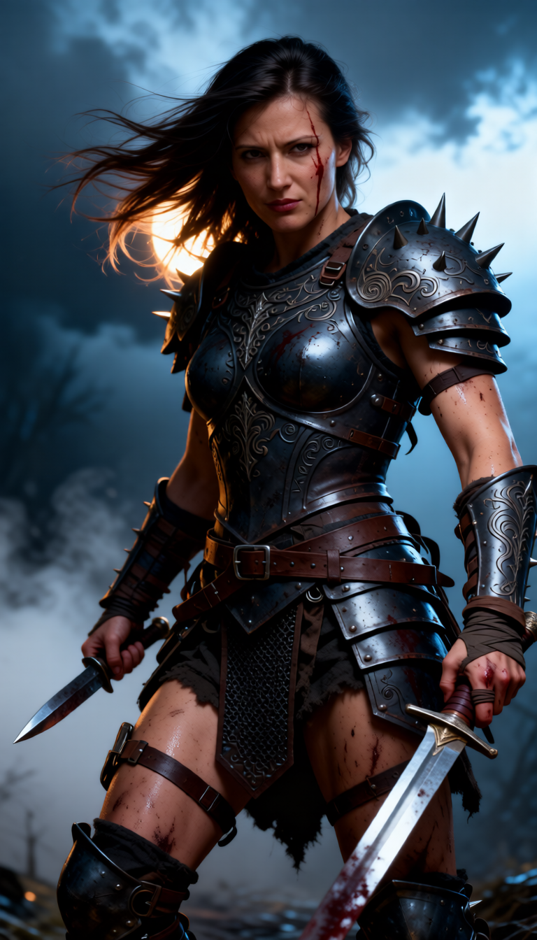 A fierce female warrior in a three-quarter, slightly low-angle full-body portrait, wind-swept dark hair and a fresh streak of blood down her cheek, intense narrowed eyes and a determined, battle-hardened expression. She wears intricately engraved dark steel armor with filigree etching — molded breastplate, layered tassets, articulated greaves, spiked pauldrons, strapped leather belts and thigh harnesses — scuffed, scratched and stained with dried blood and soot. One hand grips a dagger, the other rests near a sheathed sword; fingers bandaged, knuckles raw. Cinematic high-contrast lighting with strong rim and backlight, volumetric mist and smoky stormy background, subtle warm skin tones against desaturated cool blues and greys. Hyper-detailed, painterly realism, dramatic chiaroscuro, razor-sharp textures on metal and leather, visible pores and sweat, dynamic composition, epic dark-fantasy concept art suitable for a novel cover or game key art, high-resolution, photorealistic detail.