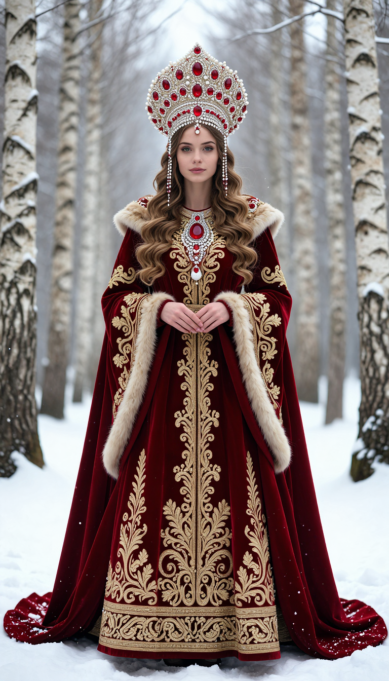 Full-length portrait of a regal young woman in a traditional Russian tsaritsa costume standing in a snow-covered birch forest, wearing an ornate kokoshnik headdress encrusted with pearls and large red gemstones, long wavy hair cascading over her shoulders, deep crimson velvet gown with opulent gold embroidery and brocade patterns, fur-lined matching cloak draped over her shoulders, hands gently clasped in front, falling snowflakes, soft diffuse winter daylight filtering through trees, serene proud expression, symmetrical centered composition, ultra-detailed embroidery and jeweled ornamentation, realistic skin tones and natural makeup, cinematic shallow depth of field with crisp fabric texture, high resolution, photorealistic, fashion-fantasy editorial mood, warm gold-red palette contrasting cool blue-white snowy background.