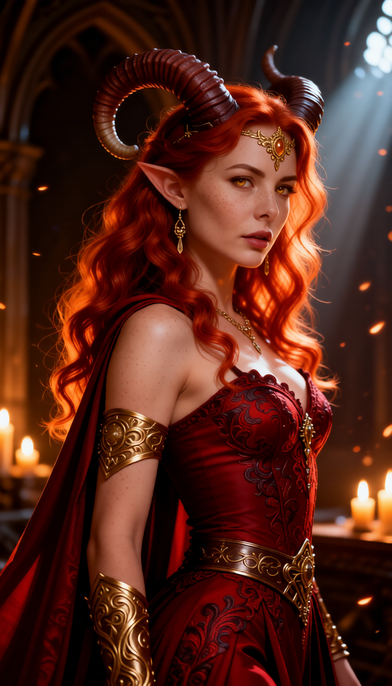 A striking fantasy portrait of a horned crimson-haired demoness in a candlelit gothic chamber, three-quarter profile, intense golden eyes and delicate elven ears, long cascading fiery curls, textured curved horns with subtle ridges, porcelain skin with light freckles, sultry expression and slightly parted lips, ornate gold forehead jewel and dangling earrings, wearing a deep red, form-fitting gown with rich brocade patterns and flowing cape, intricately engraved gold armlets and waist corset, warm amber candlelight and soft rim lighting illuminating her face and shoulders, dramatic chiaroscuro, volumetric light beams and floating embers, highly detailed skin pores and hair strands, realistic metallic reflections on jewelry, cinematic composition with shallow depth of field, soft bokeh gothic arches and candles in the background, moody, seductive, powerful atmosphere, ultra-detailed photorealistic digital painting, high resolution, sharp focus on the eyes, rich color grading, subtle film grain.