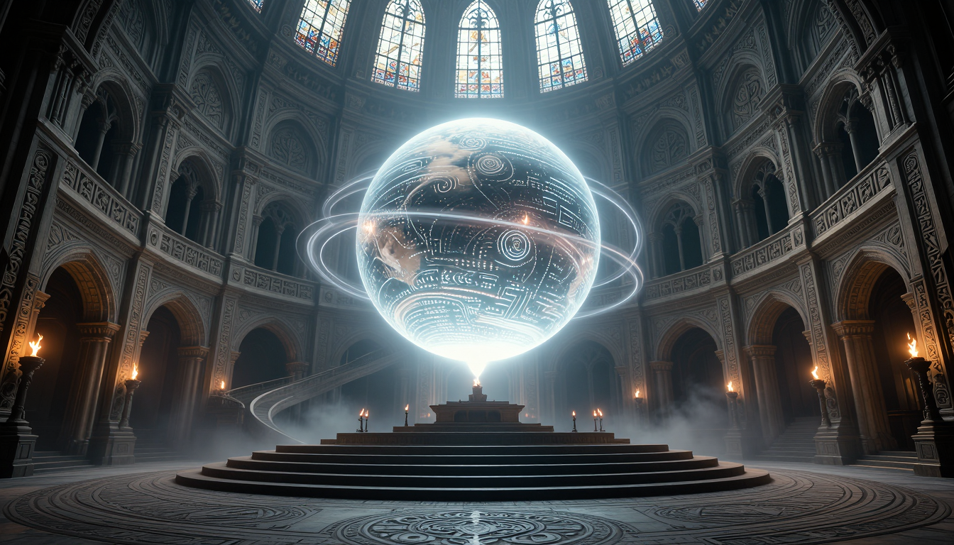 A majestic circular hall of an ancient temple, a huge glowing sphere depicting a planet hovering on a thin spiral of magical energy, bluish-white light, a surface covered with glowing wave-like runes and intricate patterns, a high dome with stained glass windows, soft daylight penetrating from above, intricate wall carvings and symbols in the Gothic style, high arched niches with burning torches casting a warm light that contrasts with the glow of the sphere, a wide multi-level stone podium with steps leading to the altar of the sphere, a curved staircase to the upper gallery, detailed magical and architectural engravings on the floor and walls, a light fog at the base creating a mystical atmosphere, majestic, tranquil, ancient magical power, cinematic lighting, ultra-detailed, 8K resolution