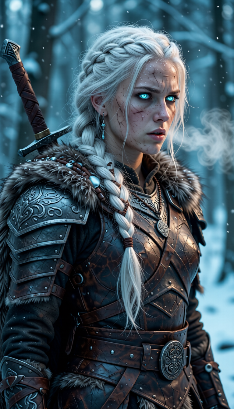 Ultra-detailed cinematic portrait of a fierce female warrior in a frozen forest, waist-up, 3/4 view, platinum-white hair in a thick loose braid with stray wisps, piercing glowing ice-blue eyes, pale skin with faint frost and battle-worn smudges, stern focused expression, slightly parted lips. She wears layered weathered leather armor and a heavy fur-lined cloak, intricately engraved metal pauldrons and a wide leather belt with a carved circular buckle, a longsword strapped across her back, delicate pendant and single dangling earring, braided leather cords and metal beads in her hair. Cold, desaturated color palette with cyan highlights, soft rim and cool key lighting, subtle warm fill to the face, gentle snowfall and misty breath in the air, shallow depth of field, high-resolution textures: individual hair strands, fur fibers, worn leather grain, scratched metal, realistic skin pores and fine scars. Epic fantasy realism, moody atmospheric fog, dramatic contrast, cinematic composition, highly detailed, photoreal finish.