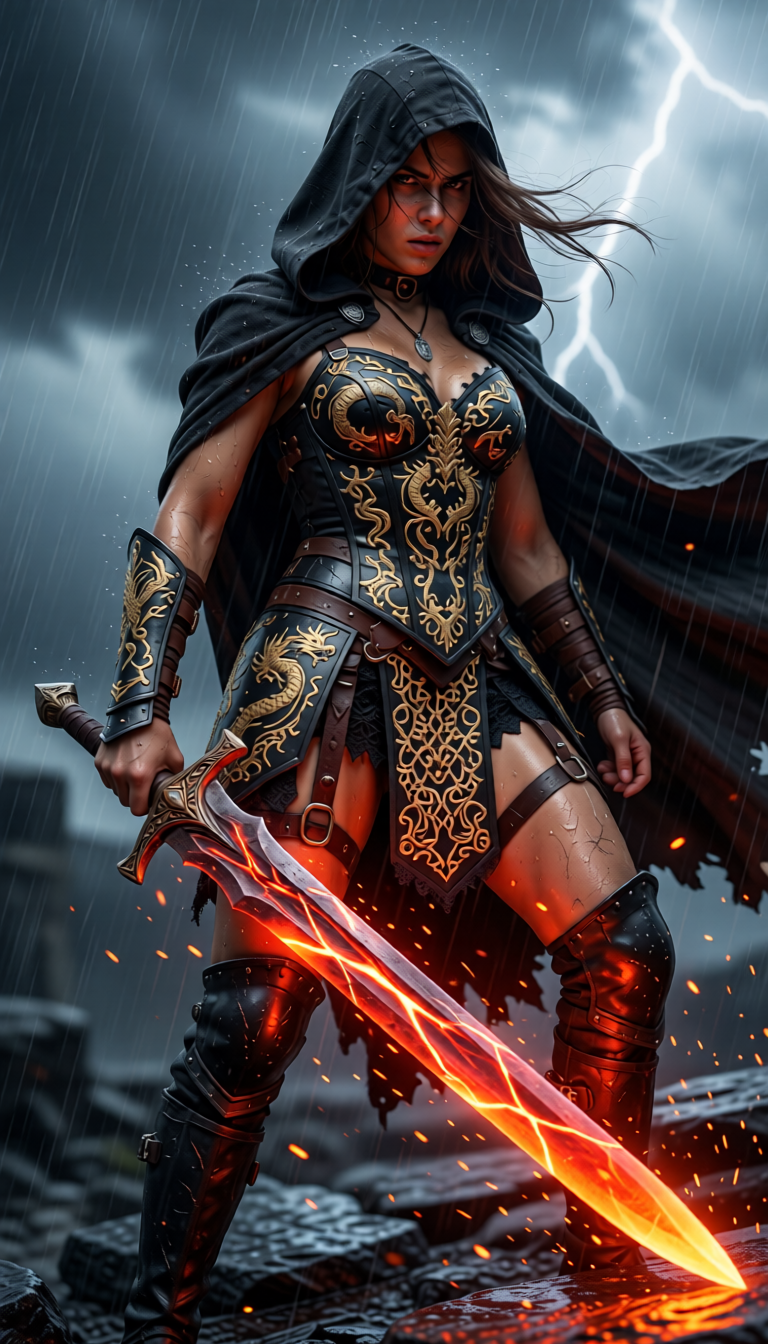 Full-body portrait of a fierce female warrior standing in a storm, wearing a dark hooded cloak and revealing intricately embroidered black and gold corset armor with dragon motifs, leather garters and thigh-high armored boots; she grips a massive ancient greatsword whose blade glows molten red-orange and cracks with fiery veins, casting embers and warm light onto wet stone as sparks scatter; cinematic low-angle composition, dramatic volumetric lighting and heavy rain streaks, wind-tossed fabric and hair, glossy wet surfaces, hyper-detailed metalwork and lace-like filigree, battle-worn leather and scratched steel, subtle skin sheen, choker pendant, intense focused expression partially shadowed by the hood, photorealistic high-detail fantasy realism, ultra-high resolution, sharp focus on face and blade, shallow depth of field, moody desaturated storm palette with warm lava contrast, dynamic motion and atmosphere.