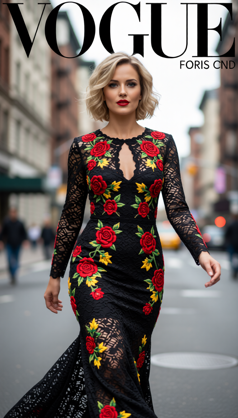 A confident woman with short blonde hair and bold red lipstick walks down a city street, wearing a striking black lace dress with embroidered red and yellow roses and a daring keyhole neckline. The fashion editorial style captures her in a dynamic pose, with a shallow depth of field blurring the urban background, creating a sense of motion and sophistication. The lighting is soft and natural, with a slightly overcast or diffused daylight that highlights her features and the intricate details of her attire. The color palette is dominated by the deep black of the dress contrasted with the vibrant reds and yellows of the floral embroidery, and the neutral tones of the street. The mood is empowering and chic, evoking a high-fashion photoshoot. Shot at eye-level with a slightly wide-angle lens, emphasizing her presence and the environment. High detail, photorealistic, cinematic, vogue magazine cover quality.